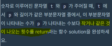 def solution(t, p): int_p = int(p) t_list = [] for i in range(len(t)): nums = t[i:(len(p)+i)] if len(nums) == len(p): t_list.append(int(nums)) result = 0 for i in t_list: if int_p >= i: result += 1 return (result)[실수를 통해 느낀 점]