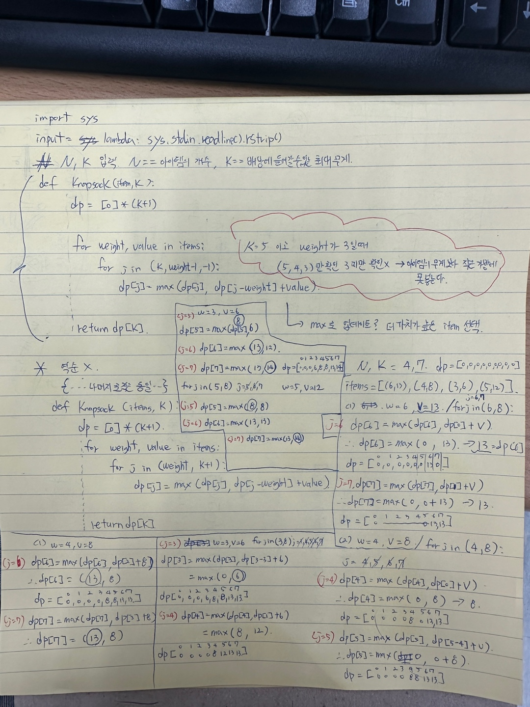 def knapsack(items, K): dp = [0] * (K + 1) for weight, value in items: for j in range(K, weight - 1, -1): dp[j] = max(dp[j], dp[j - weight] + value) return dp[K] import sys input = lambda: sys.stdin.readline().strip() N, K = map(int, input().split()) items = [tuple(map(int, input().split())) for _ in range(N)] print(knapsack(items, K))- 역순으로 처리해주는 이유는 현재 아이템을 사용할 때, 이전의 dp배열을 수정하지 않기 위해서이다.