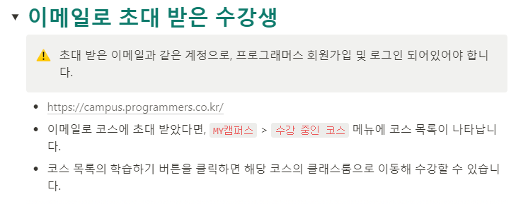 그 중 가장 헷갈렸던 캠퍼스 코스 수강하기 중 이메일로 초대 받은 수강생일 때, 수강하는 방법에 대해 알려주려고 한다.