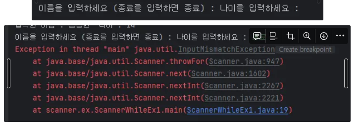 package scanner.ex; import java.util.Scanner; public class ScannerWhileEx1 { public static void main(String[] args) { Scanner input = new Scanner(System.in); while (true) { System.out.print("이름을 입력하세요 (종료를 입력하면 종료) : "); String name = input.nextLine(); if (name.equals("종료")) { System.out.println("프로그램을 종료합니다."); break; } System.out.print("나이를 입력하세요 : "); int age = input.nextInt(); System.out.println("입력한 이름 : " + name + " 나이 : " + age); } } }