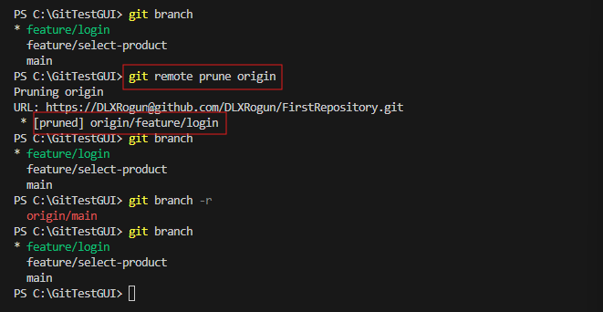 - 로컬 브랜치가 아직 삭제되지 않았을 경우: git remote prune origin은 로컬에서 원격 브랜치 추적 참조를 삭제합니다. 그러나 이 명령은 로컬 브랜치 자체를 삭제하지는 않습니다. 따라서 feature/login 브랜치가 로컬에서 직접 생성되었다면 git branch -d feature/login을 사용하여 로컬에서 해당 브랜치를 삭제해야 합니다.