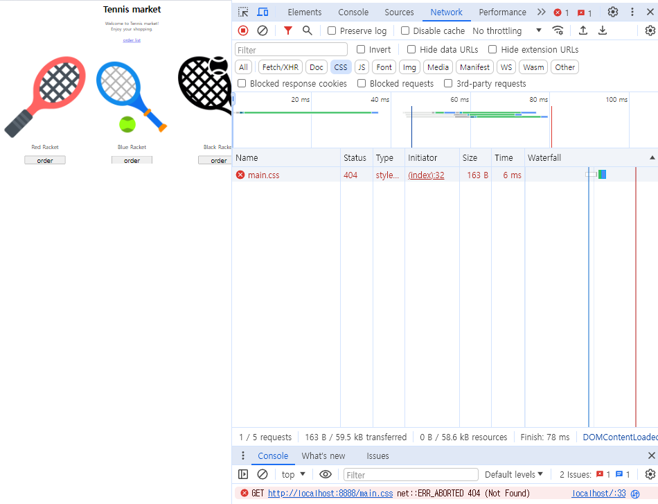 반가운 오류 ㅎㅎ 한시간째 붙들고 있네 ~ <!--main.html--> <!DOCTYPE html> <html> <head> <meta charset="UTF-8"> <title>Main</title> <link rel="stylesheet" href="main.css"> <!--이부분--> </head> <body> <h1>Tennis market</h1> <div id="txt_welcome"> Welcome to Tennis market! <br> Enjoy your shopping. <br> <br> <a href="./orderlist.html">order list</a> </div> <div style="display:grid; grid-template-columns: 1fr 1fr 1fr;"> <div class="card" id="redRacket"> <img class = "card_img" src ="./img/redRacket.png"> <p class="card_title">Red Racket</p> <input class = "card_button"type="button" value="order" onclick="location.href='/order?ProductId=1'"> </div> <div class="card"id="blueRacket"> <img class = "card_img" src ="./img/blueRacket.png"> <p class="card_title">Blue Racket</p> <input class = "card_button"type="button" value="order" onclick="location.href='/order?ProductId=2'"> </div> <div class="card"id="blackRacket"> <img class = "card_img" src ="./img/blackRacket.png"> <p class="card_title">Black Racket</p> <input class = "card_button"type="button" value="order" onclick="location.href='/order?ProductId=3'"> </div> </div> </body> </html>