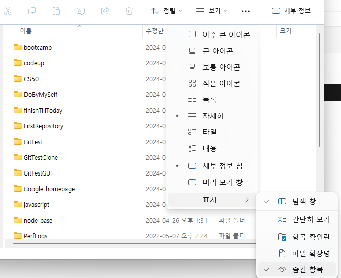 4. 해당 폴더가서 보기 -> 표시 -> 숨긴 항목 누릅니다.
