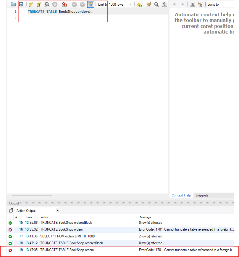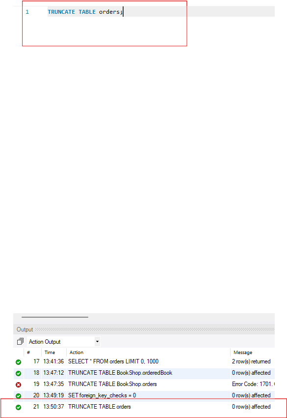 -- 외래 키 제약 조건 제거 ALTER TABLE BookShop.orderedBook DROP FOREIGN KEY fk_orderedBook_orders_id; -- 테이블 TRUNCATE TRUNCATE TABLE BookShop.orderedBook; -- 외래 키 제약 조건 다시 추가 ALTER TABLE BookShop.orderedBook ADD CONSTRAINT fk_orderedBook_orders_id FOREIGN KEY (order_id) REFERENCES BookShop.orders(id);사용 예시를 보여드리겠습니다.